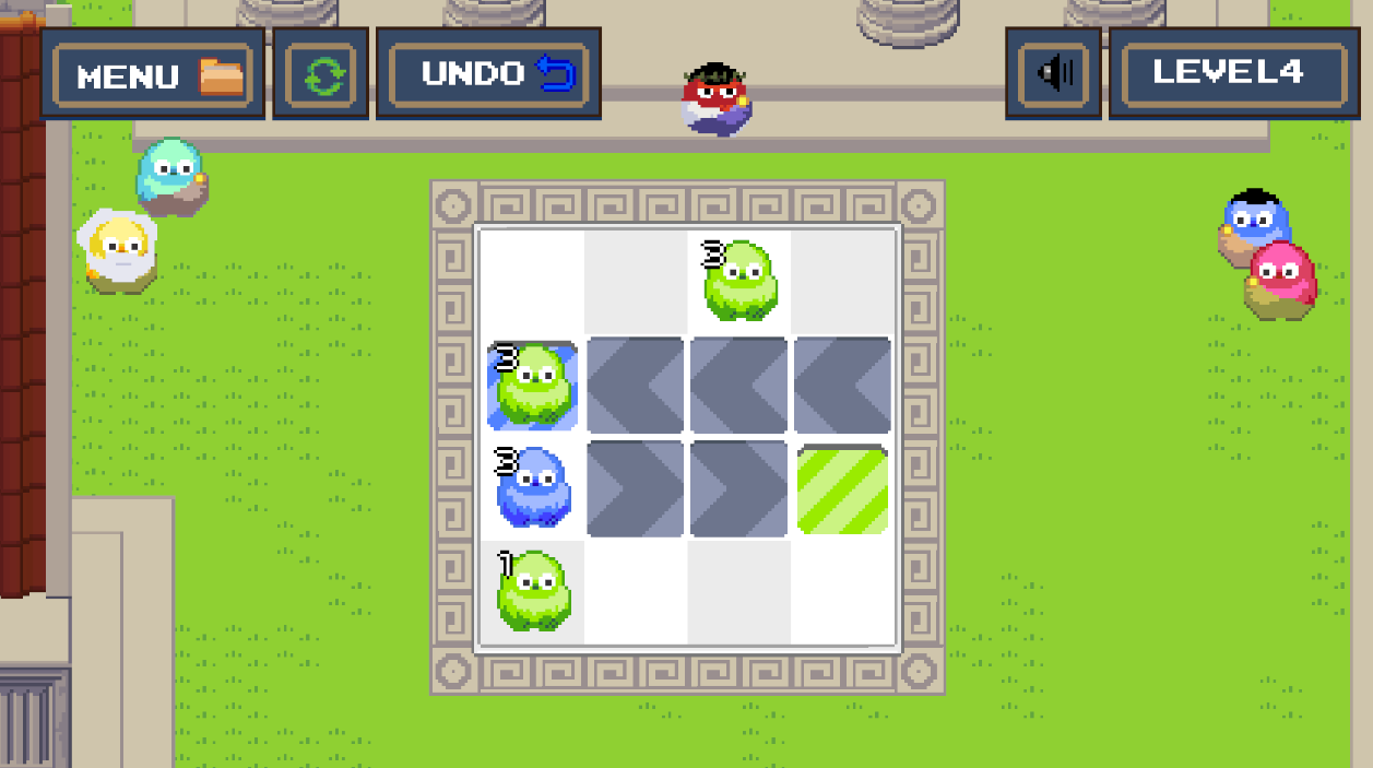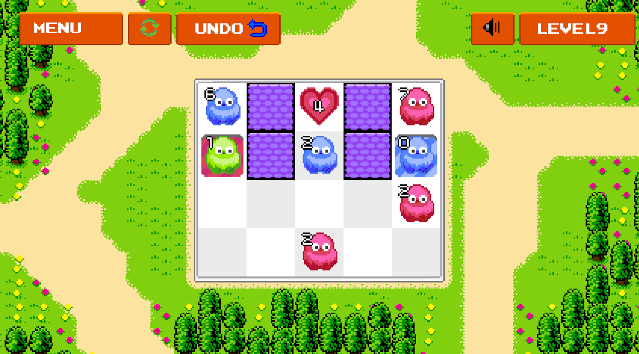 Each Gruffle has energy. Every move costs 1 energy, and when a Gruffle runs out, it can’t walk anymore. Your goal is to cover every target with a Gruffle of the matching color.